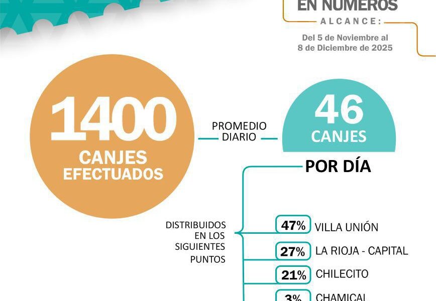 En cuanto a los canjes efectuados, Villa Unión concentró el 47% de los mismos, La Rioja Capital, 27%, Chilecito, 21%, Chamical, 3%, Aimoagasta, 2%.