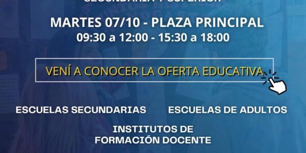 Este martes nos encontramos en la Plaza Principal de Chilecito para conocer todas las opciones educativas: escuelas secundarias, institutos de formación docente, de formación en técnico profesional, de formación de agentes de seguridad y mucho más.