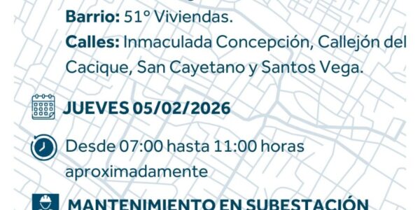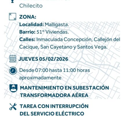 La empresa distribuidora de energía de la provincia de La Rioja informa corte en el suministro de energía eléctrica para el jueves 05 de febrero en el Distrito de Malligasta en las calles Inmaculada Concepcion, callejón del Cacique, San Cayetano,…