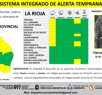 El Sistema Integrado de Alerta Temprana (SIAT) emitió un alerta amarilla por la probable ocurrencia de lluvias aisladas y vientos para distintas zonas del territorio provincial.