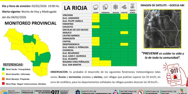 El Sistema Integrado de Alerta Temprana (SIAT) emitió un alerta amarilla por la probable ocurrencia de lluvias, tormentas aisladas y vientos para distintas zonas del territorio provincial. El alerta por lluvias rige para los departamentos Vinchina, General Lamadrid, General Felipe…