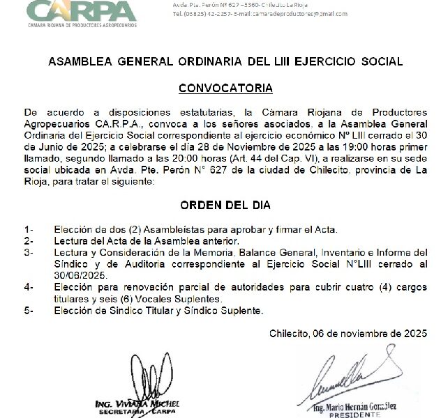 La Cámara Riojana de Productores Agropecuarios llama a una nueva asamblea. –