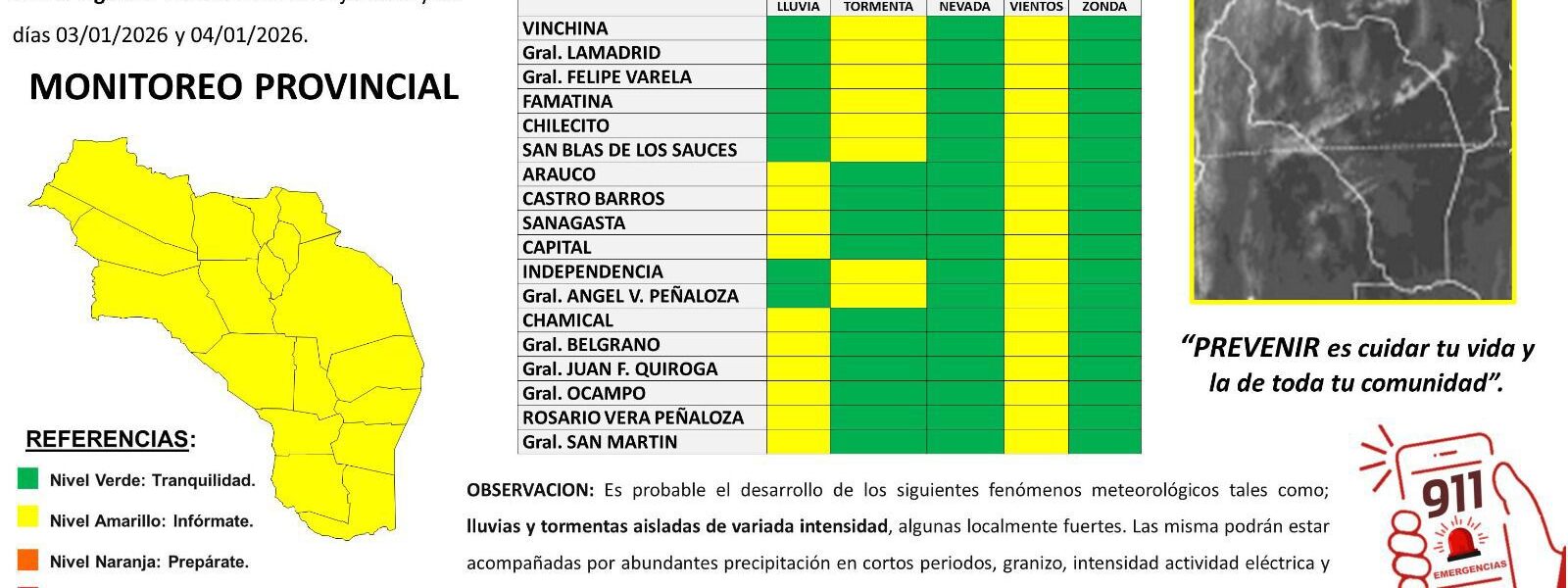 De acuerdo al reporte del organismo, el alerta amarrillo por el probable desarrollo de lluvias rige para los departamentos Arauco, Castro Barros, Sanagasta, Capital, Chamical, General Belgrano, Juan Facundo Quiroga; General Ocampo, Rosario Vera Peñaloza, y General San Martín.