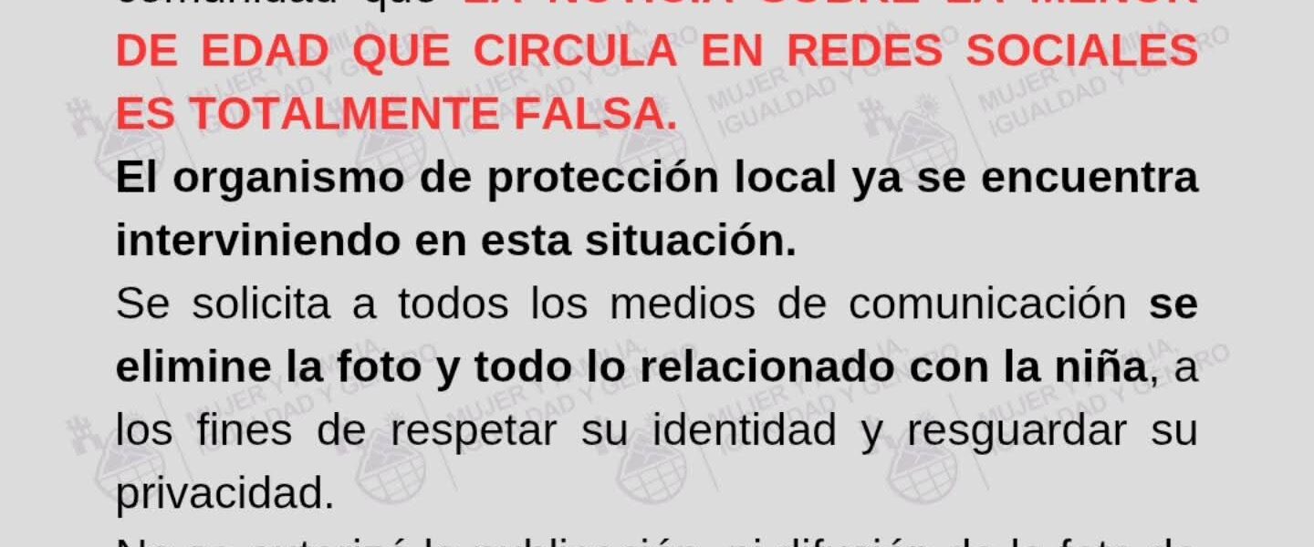 Solicitamos de manera urgente y responsable a todos los medios de comunicación y usuarios de redes sociales eliminar la imagen y todo contenido relacionado con la niña, a fin de respetar su identidad y resguardar su privacidad.
