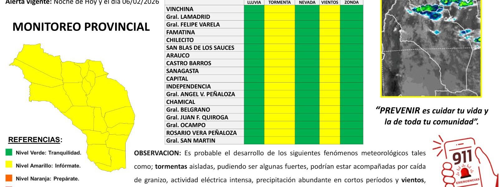 El Sistema Integrado de Alerta Temprana (SIAT) emitió un alerta amarilla por la probable ocurrencia de tormentas aisladas y vientos para todo el territorio provincial.