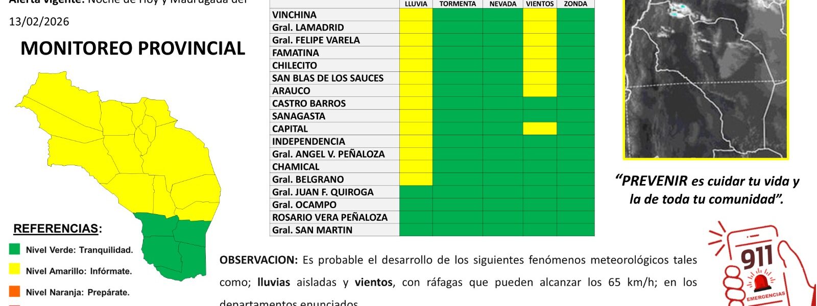 El reporte del SIAT informó que el alerta por lluvias rige para los departamentos Vinchina, General Lamadrid, General Felipe Varela, Famatina, Chilecito, San Blas de los Sauces, Arauco, Castro Barros, Sanagasta, Capital, Independencia, General Ángel Vicente Peñaloza, Chamical y General Belgrano.