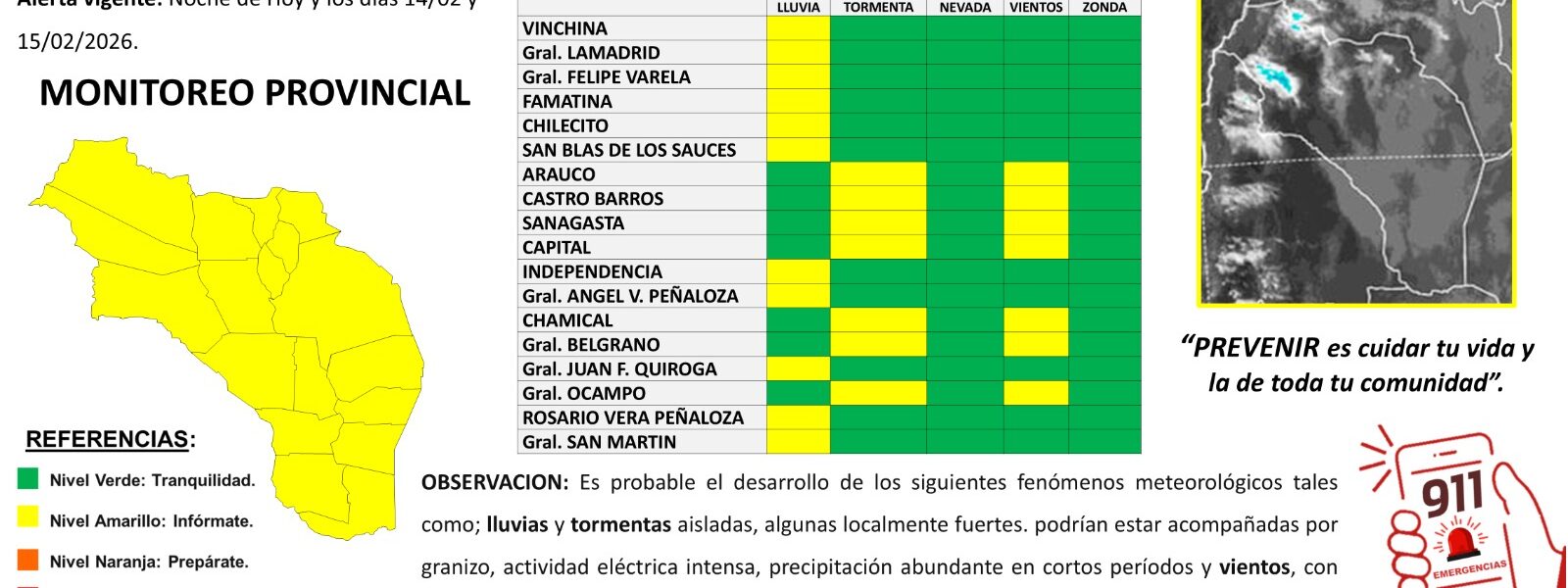 El alerta por lluvias rige para los departamentos Vinchina, General Lamadrid, General Felipe Varela, Famatina, Chilecito, San Blas de los Sauces, Independencia, General Ángel Vicente Peñaloza, General Juan Facundo Quiroga, Rosario Vera Peñaloza y General San Martín.