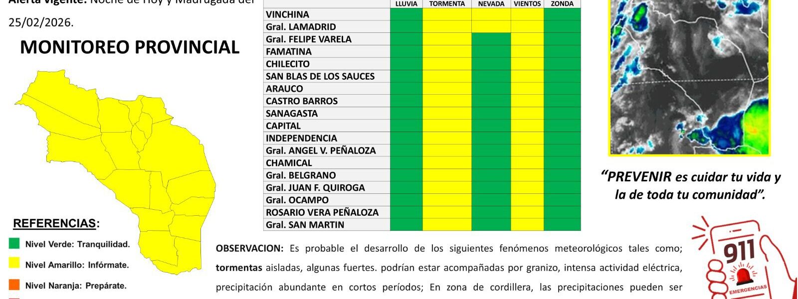 El Comité de Emergencia (COE) La Rioja emitió una Alerta Amarilla para todo el territorio provincial por el posible desarrollo de tormentas aisladas y vientos, con mayores probabilidades para la noche de hoy, martes 24 de febrero y madrugada del miércoles 25. No se descarta el desarrollo de eventos aislados.
