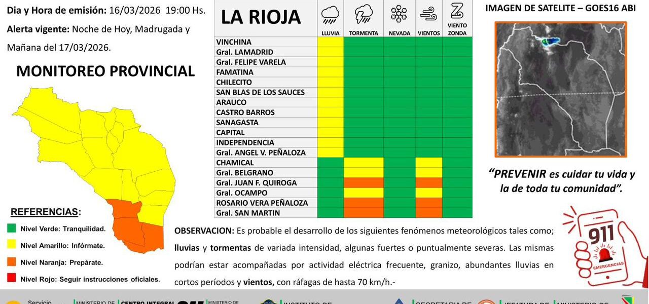 Este alerta preventivo por lluvias es de nivel amarillo para los departamentos Vinchina, General Lamadrid, General Felipe Varela, Famatina, Chilecito, San Blas de los Sauces, Arauco, Castro Barros, Sanagasta, Capital, Independencia y General Ángel Vicente Peñaloza.