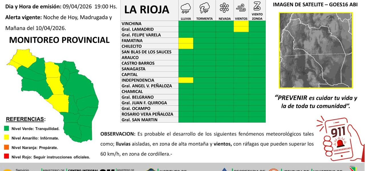 Según el informe, es probable el desarrollo de lluvias aisladas en los departamentos Independencia, Famatina y Chilecito. En tanto, el alerta por vientos con ráfagas que pueden superar los 60 kilómetros por hora, es para los departamentos Vinchina y General Lamadrid.