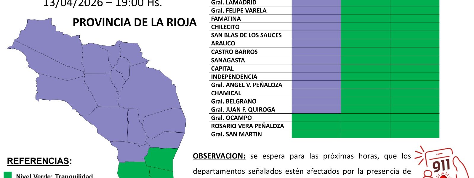 De acuerdo al informe, es probable el desarrollo de lluvias aisladas en toda la provincia de La Rioja. En tanto, la advertencia por vientos con ráfagas que pueden superar los 60 kilómetros por hora es para los departamentos Vinchina, General Lamadrid, Arauco, Capital, Independencia, Chamical y General Belgrano.