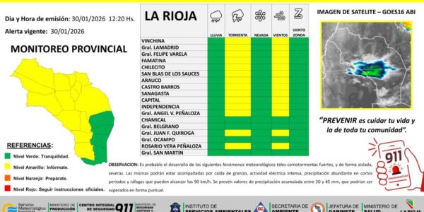 Desde el Comité Operativo de Emergencia informaron que se reporta una intensa tormenta con caída de granizo y abundante precipitación sectorizada en el departamento Independencia, (Patquia) se recomienda para quienes circulen por las distintas rutas tomen precauciones.